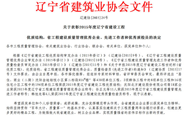 根據(jù)《遼寧省建設(shè)工程優(yōu)質(zhì)結(jié)構(gòu)審定辦法(2015年修訂)》(遼建協(xié)[2015]9號(hào))、《遼寧省工程建設(shè)質(zhì)量管理優(yōu)秀企業(yè)審定辦法(2015年修訂)》(遼建協(xié)[2015]10號(hào))文件精神,由企業(yè)自愿申報(bào),市擇優(yōu)推薦審核,省評(píng)審委員會(huì)審定,遼寧綏四建設(shè)工程集團(tuán)榮獲以下榮譽(yù)和獎(jiǎng)項(xiàng): (一)遼寧綏四建設(shè)工程集團(tuán)有限公司被評(píng)為2015年度遼寧省工程建設(shè)質(zhì)量管理優(yōu)秀企業(yè)。 。ǘ┘瘓F(tuán)榮獲省優(yōu)質(zhì)主體結(jié)構(gòu)獎(jiǎng)項(xiàng)工程: 1、綏中縣全民健身活動(dòng)中心; 2、葫蘆島市龍港區(qū)兩河三村回遷樓改造二期一標(biāo)段1#樓; 3、葫蘆島市龍港區(qū)兩河三村回遷樓改造二期一標(biāo)段2#樓; 4、葫蘆島三和榮郡1#住宅樓; 5、葫蘆島三和榮郡2#住宅樓; 6、葫蘆島三和榮郡3#住宅樓; 7、葫蘆島三和榮郡4#住宅樓; 8、葫蘆島三和榮郡5#住宅樓; 9、葫蘆島三和榮郡6#住宅樓; 10、葫蘆島三和榮郡7#住宅樓; 11、葫蘆島三和榮郡8#住宅樓; 我集團(tuán)將繼續(xù)認(rèn)真落實(shí)住建部關(guān)于工程質(zhì)量?jī)赡曛卫硇袆?dòng)要求,創(chuàng)建出更多更好的精品工程,樹立企業(yè)品牌,為做強(qiáng)做大遼寧省建筑業(yè)的宏偉目標(biāo)作出新的貢獻(xiàn)。