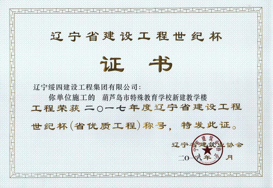 “葫蘆島市特殊教育學(xué)校新建教學(xué)樓工程”榮獲2017年度遼寧省建設(shè)工程世紀(jì)杯稱號(hào)