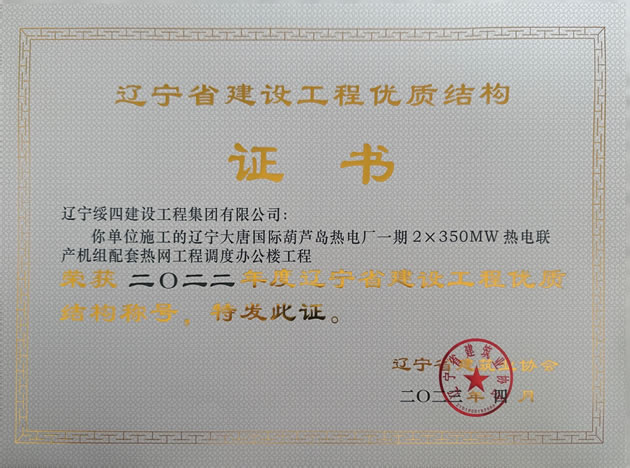 遼寧大唐國際葫蘆島熱電廠一期2X350MW熱電聯(lián)產(chǎn)機組配套熱網(wǎng)工程調度辦公樓工程榮獲2022年度遼寧省建設工程優(yōu)質結構稱號